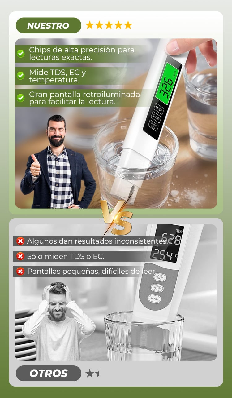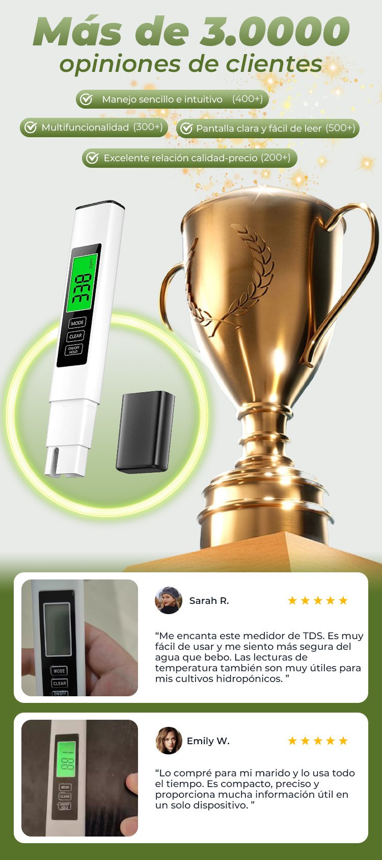 Por su precio, este medidor es increíble. Lo comparé con un modelo más caro y las lecturas eran casi idénticas. Es perfecto para comprobar la calidad del agua que bebo y asegurarme de que mi filtro de agua funciona correctamente. Me encanta.