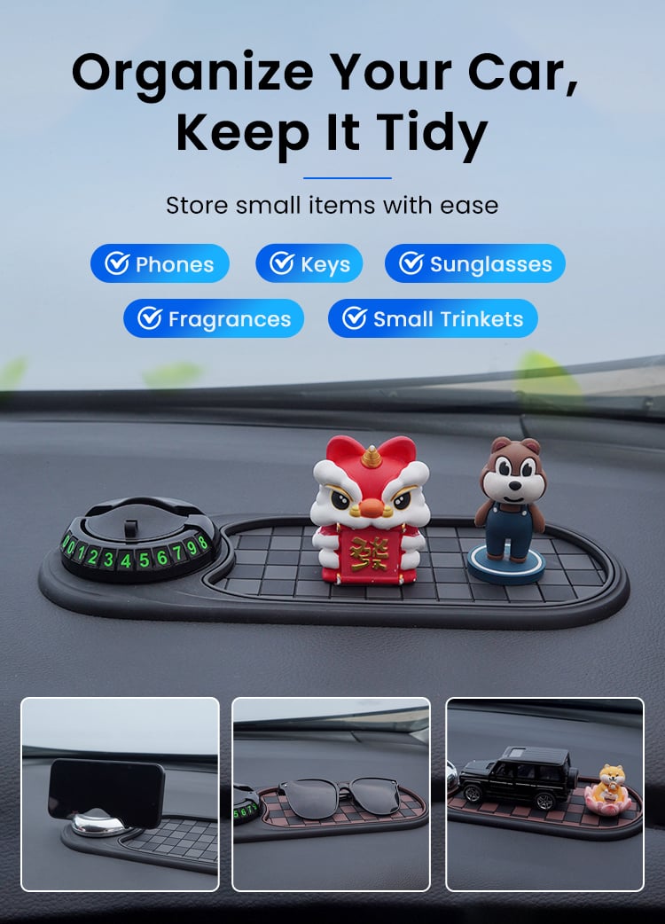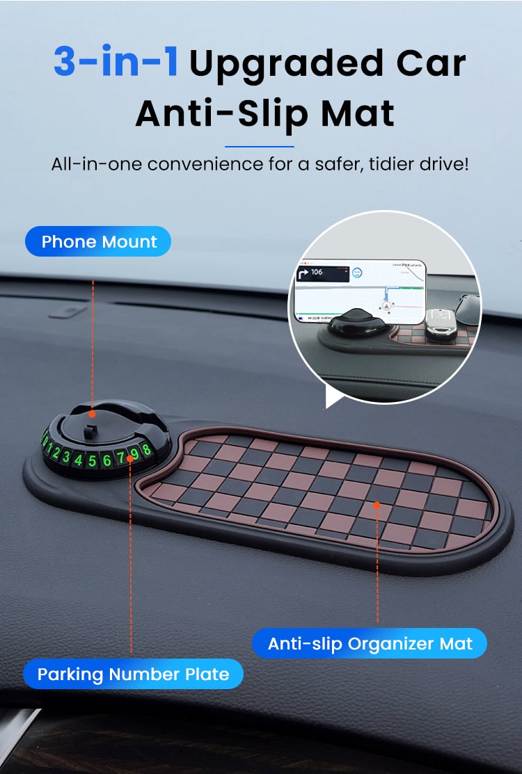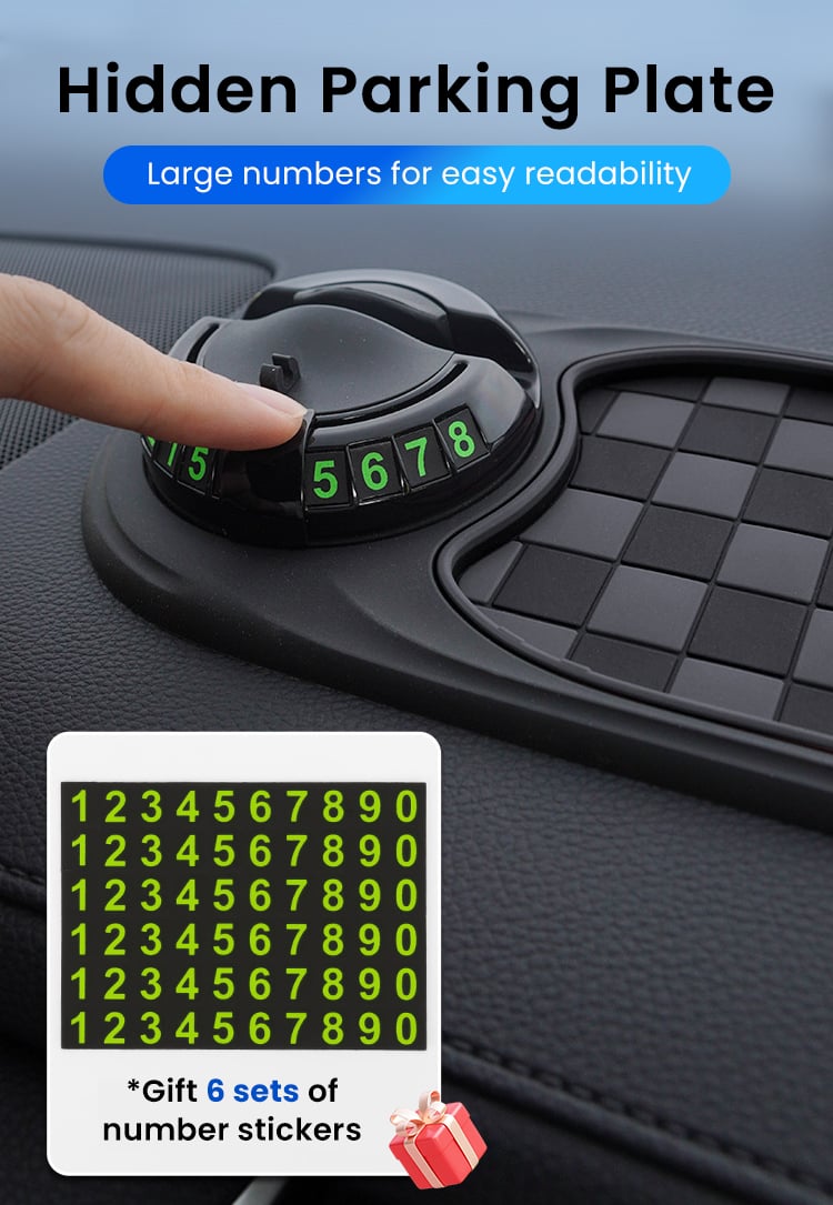 This anti-slip mat is a game changer! Keeps my phone and keys in place, even during sharp turns. Love the added parking number plate feature too!