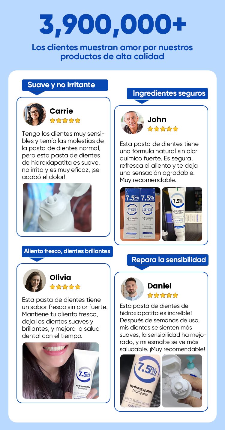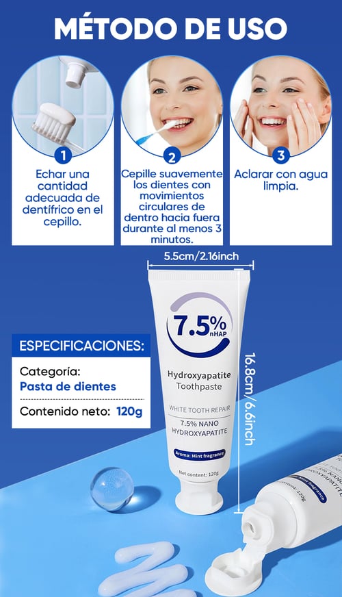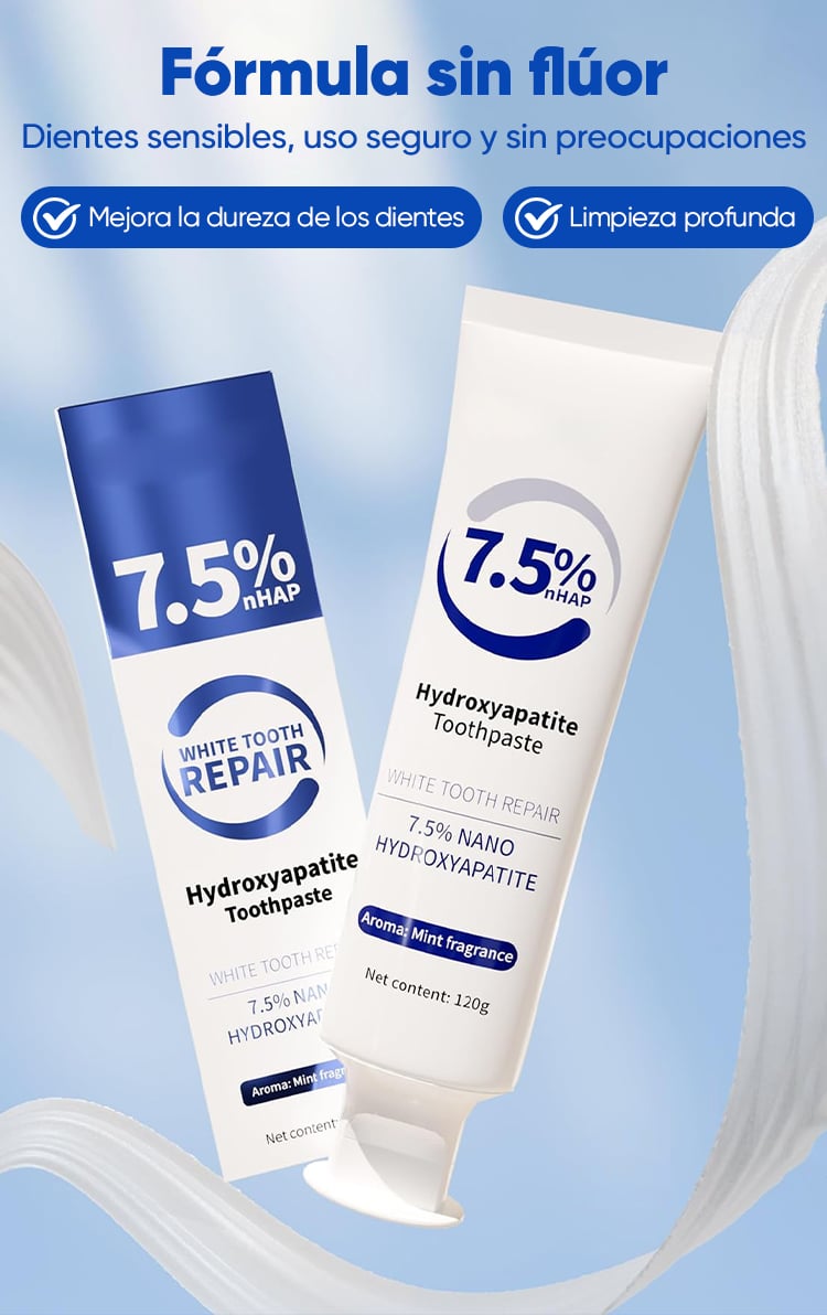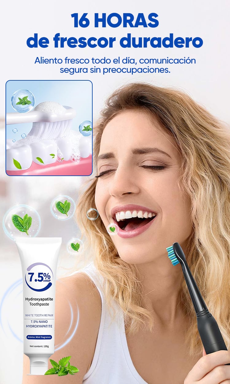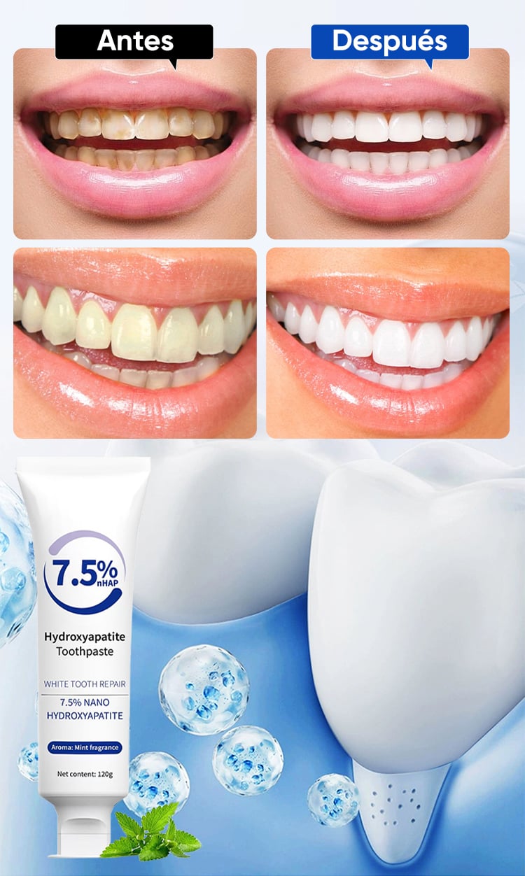 Fortificado con 7,5% de Nano Hidroxiapatita, este dentífrico repara eficazmente el esmalte, fortalece los dientes y promueve una sonrisa naturalmente más blanca.