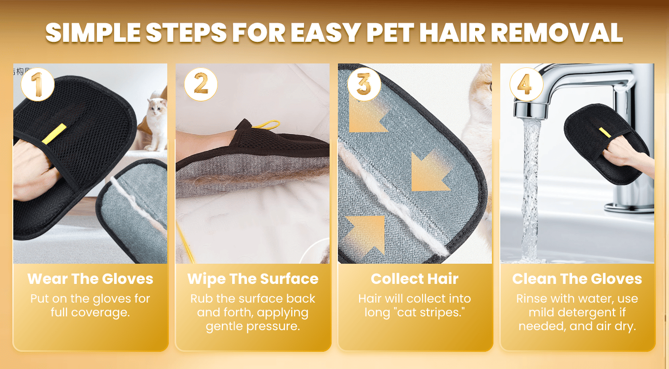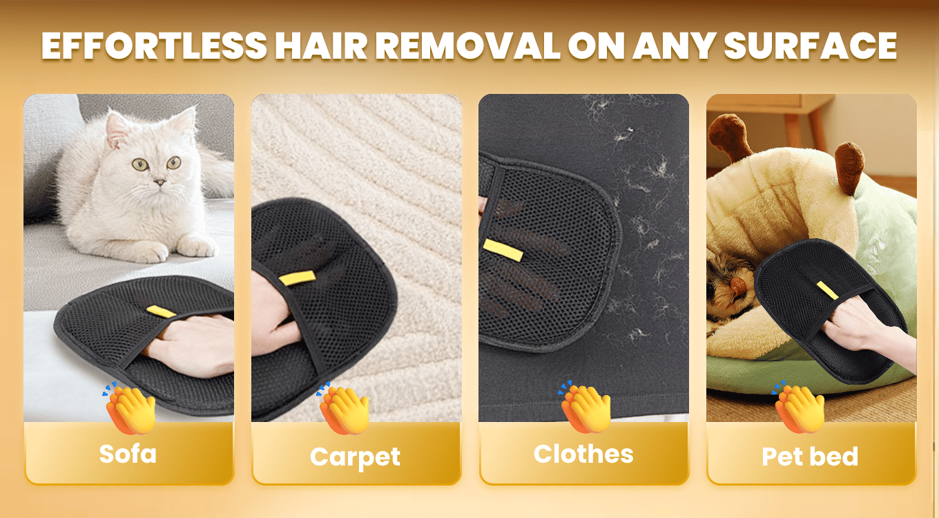 Show how easily the glove picks up pet hair from various surfaces (clothes, sofas, carpets).