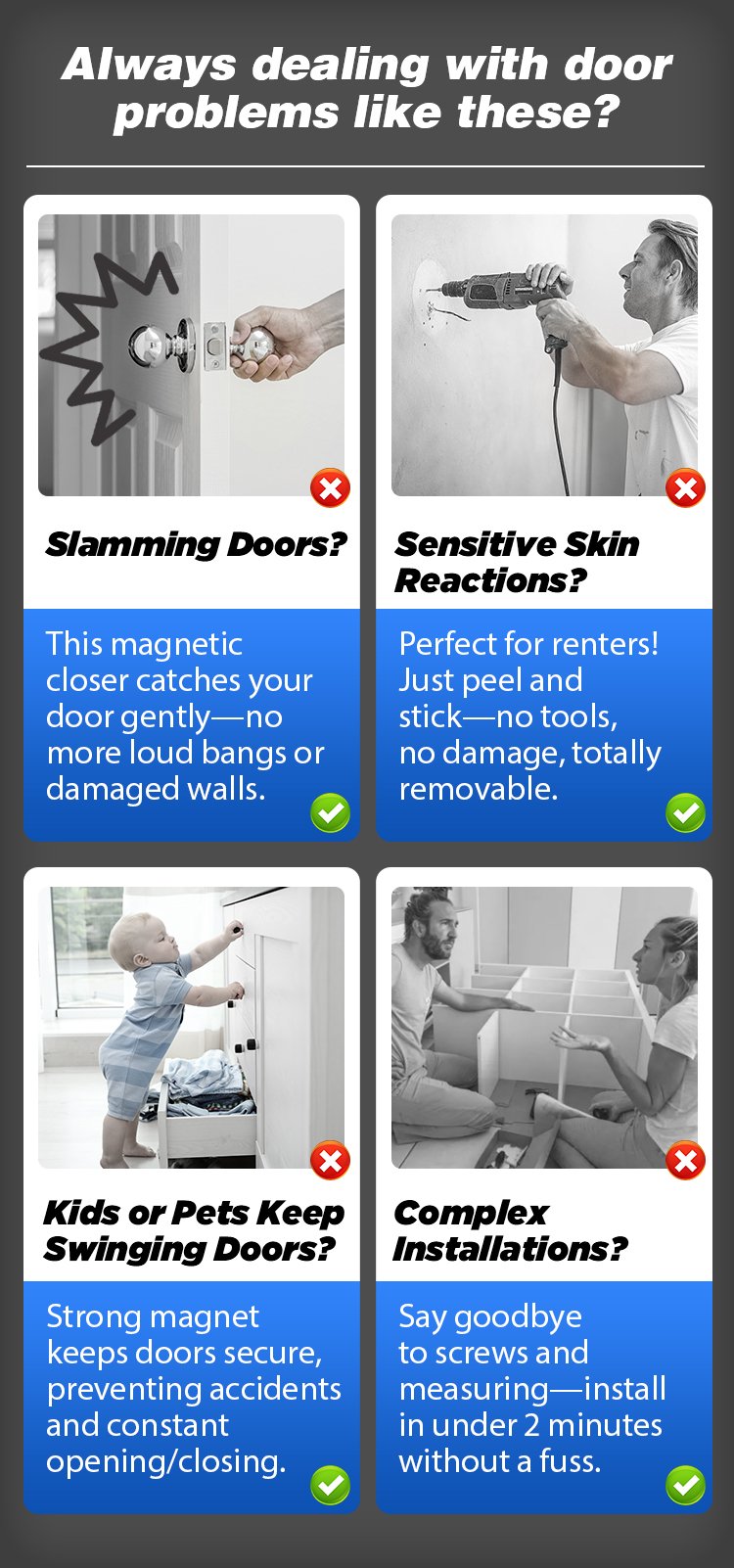 I am absolutely thrilled with this magnetic door closer! The quiet and smooth closure is like poetry in motion. No more annoying door slams or sudden bangs disturbing the peace in my home.