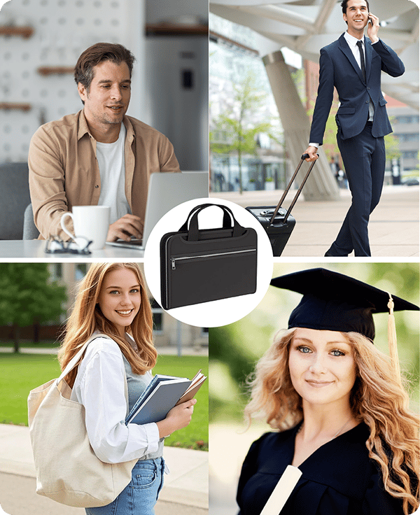 Sized at 14.6" x 10.23"(37.1 x 26.0 cm), this folder includes: External Front Pocket – Quick access to phone, pens, ID, or small valuables. Dual Zippers – Secure everything inside with ease. Durable Hand Strap – Grab and go at a moment’s notice